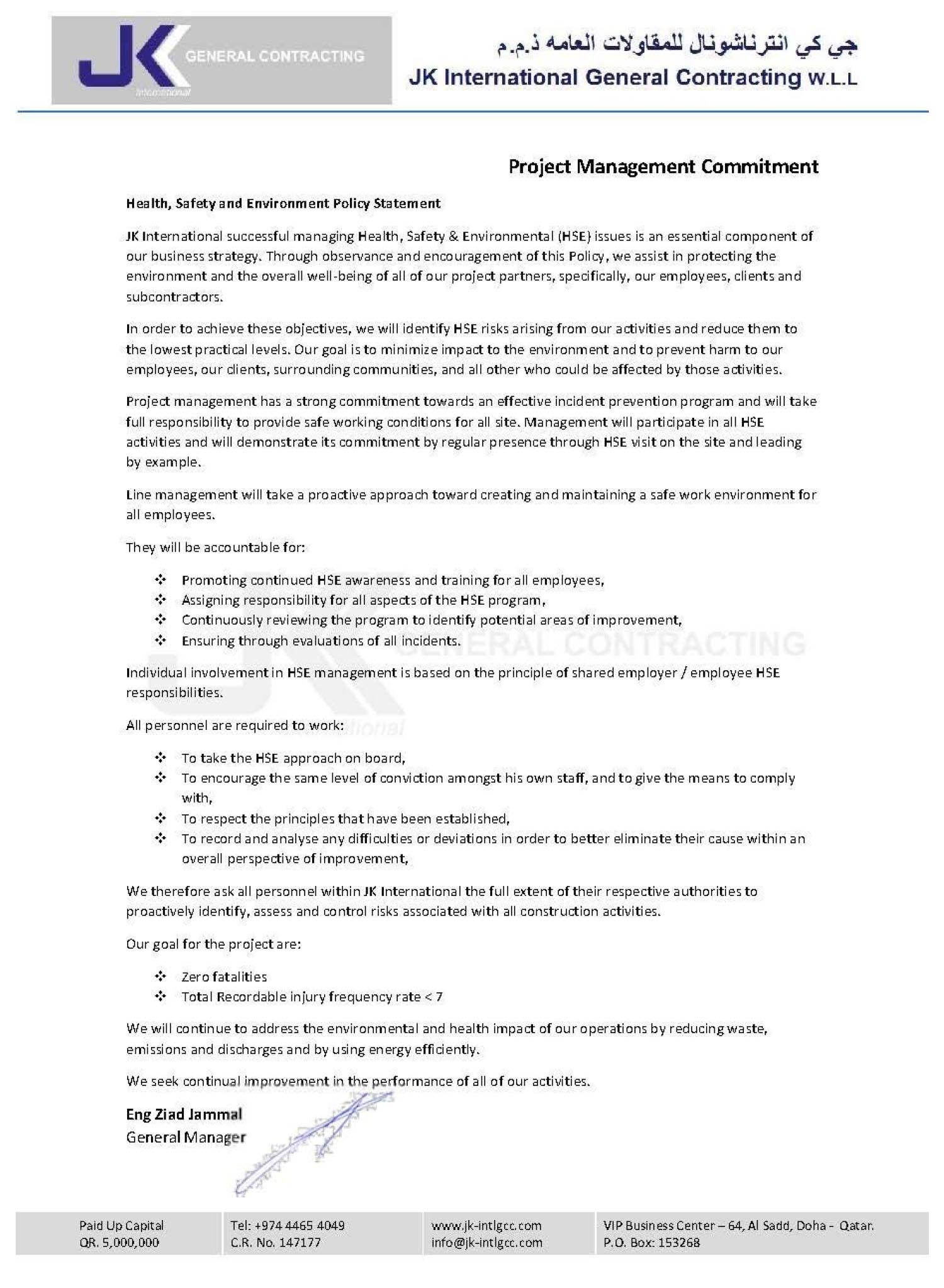 JK International is a Qatari based international construction company. Our impressive construction footprint in Qatar is led by our ever-growing pool of trained professionals. With over 250 work force, 45 plants and machines and over 2 million complied total build up area of diverse projects in the sectors of infrastructure and heavy construction building and oil & gas.